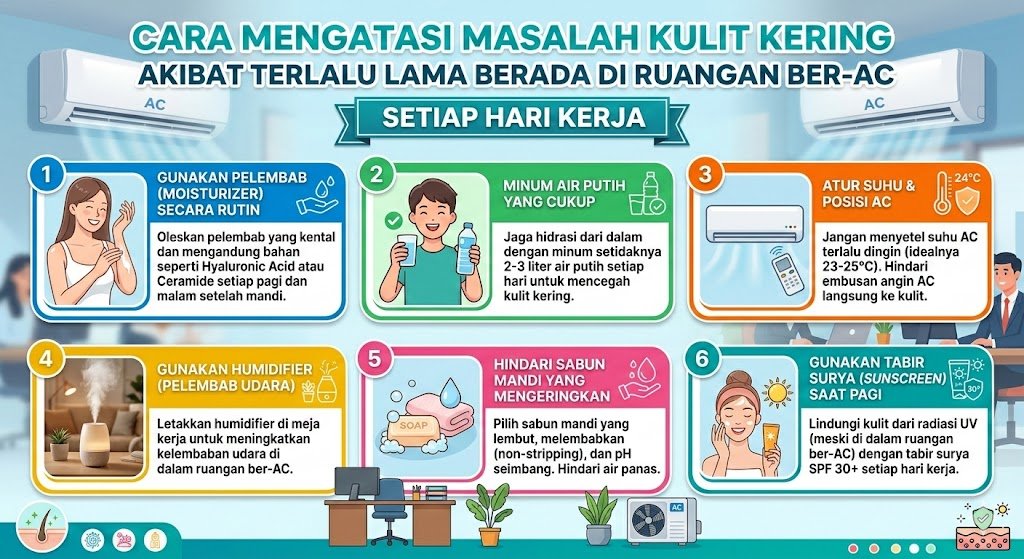 Dengan menerapkan langkah-langkah di atas secara disiplin, Anda tetap bisa menikmati kenyamanan bekerja di ruangan ber-AC tanpa harus mengorbankan kesehatan dan kecantikan kulit. Keseimbangan antara perawatan eksternal, hidrasi internal, dan modifikasi lingkungan adalah kunci utama kulit tetap sehat, kenyal, dan bercahaya.